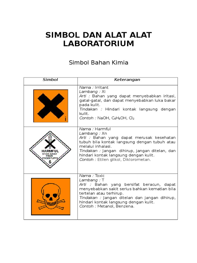 Alat alat laboratorium dan simbol bahan kimia. Puji syukur kami panjatkan kehadirat tuhan yang maha esa karena dengan rahmat karunia serta taufik dan hidayah nya kami dapat menyelesaikan makalah tentang simbol. Bagi mahasiswa jurusan sains laboratorium merupakan rumah kedua setelah kos rumah. Erlenmeyer yaitu alat yang digunakan untuk membuat larutan terutama titrasi menggunakan buret. Semua itu dibedakan karena memiliki jenis peralatan yang khas dan sesuai dengan fungsi dan kegunaannya masing masing.