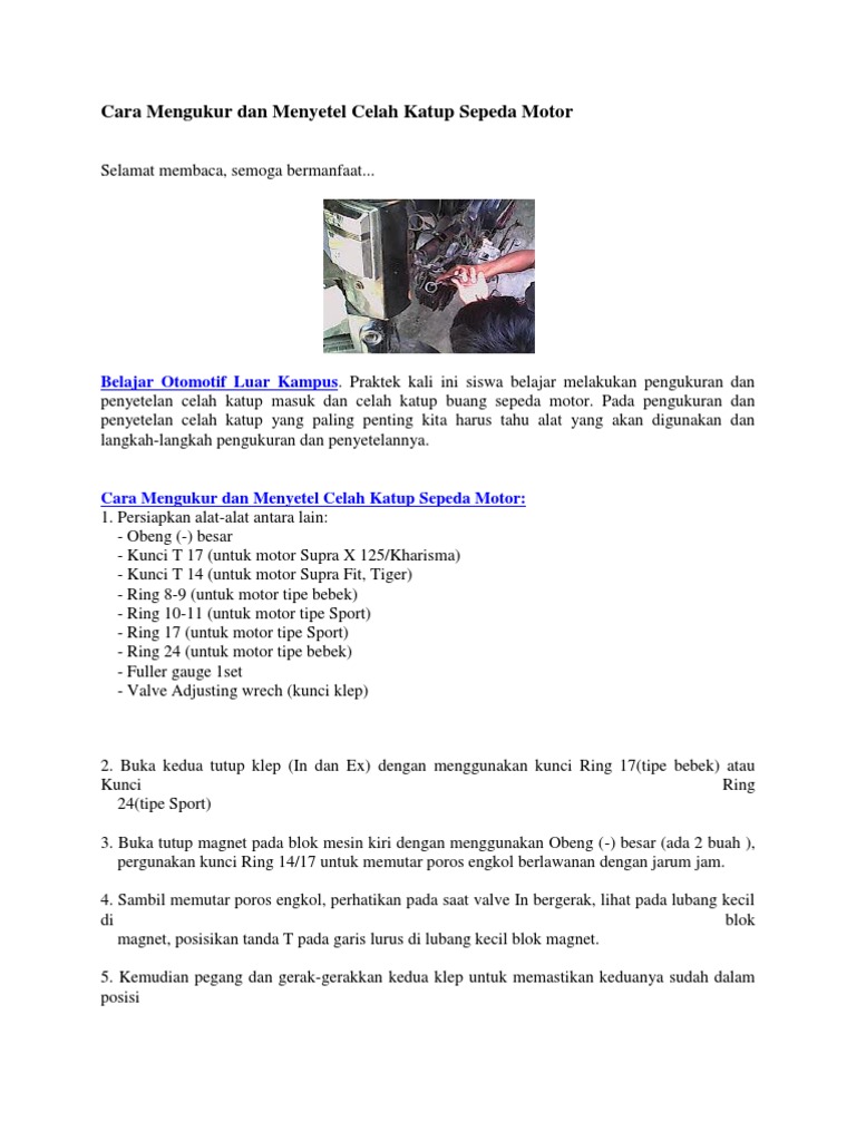 Menyetel celah katup valve clearance merupakan salah satu dari langkah penyetelan awal sebelum menghidupkan mesin. Meskipun berbeda cara penyetelan katup namun sebenarnya prosedur yang dilakukan sama. Akibat bukaan katup yang lebih lama akan membuat kerugian gas baru gas baru akan terbuang ke saluran exhaust karena bukaan katup exhaust lebih lama sehingga putaran idle menjadi tidak stabil mesin menjadi bergetar. Kunci t 17 untuk motor supra x 125 kharisma kunci t 14 untuk motor supra fit tiger ring 8 9 untuk motor tipe bebek ring 10 11 untuk motor tipe sport ring 17 untuk motor tipe sport ring 24 untuk motor tipe bebek.