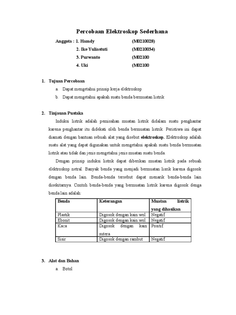 Kirimkan ini lewat email blogthis. Tujuan percobaan tujuan kami melakukan percobaan ini adalah untuk dapat membuat mengetahui konsep cara kerja dan dapat menggunakan elektroskop sederhana untuk mendeteksi muatan pada penggaris plastik yang digosok pada rambut. Ambil aluminium foil bekas bungkus cokelat dan pisahkan plastik yang menempel pada aluminium dengan cara membakarnya hingga aluminium bersih dari kertas yang menempel. Alat dan bahan elektroskop sederhana sebelum diberi muatan dari penggaris saat diberi muatan dari penggaris diposting oleh unknown di 23 51.