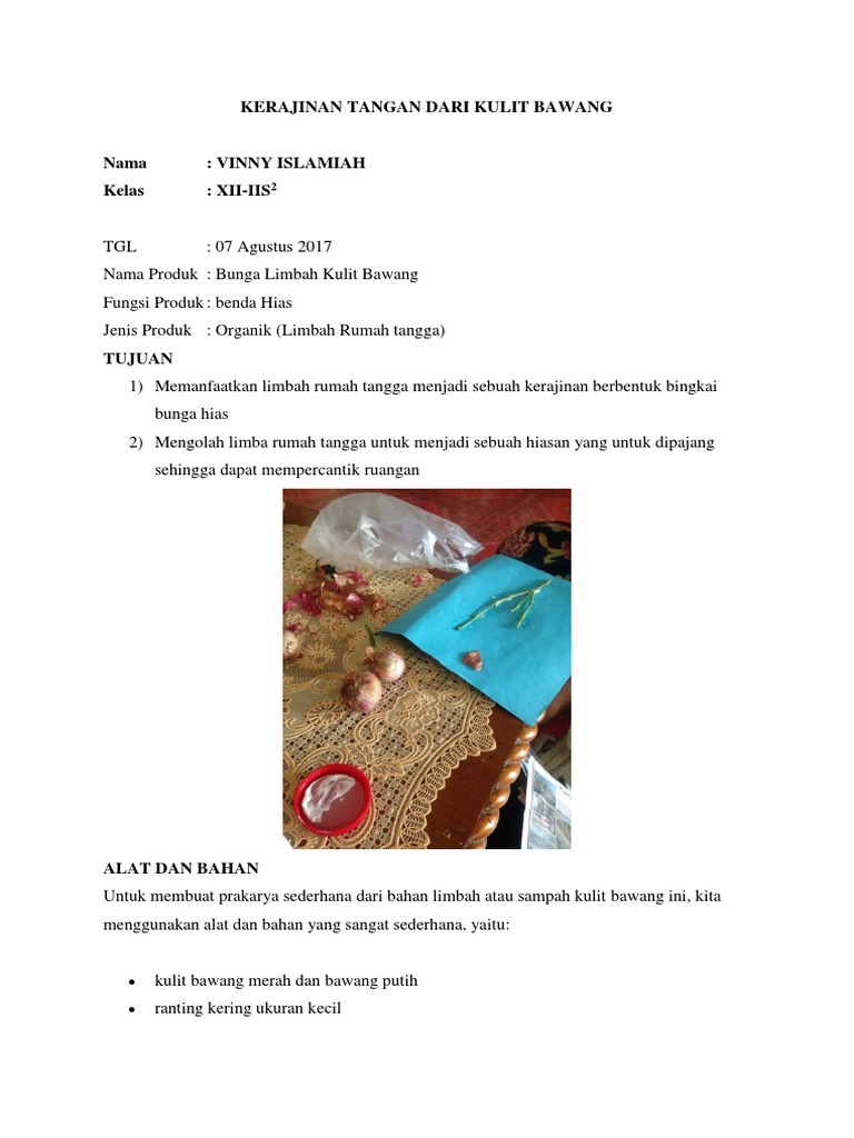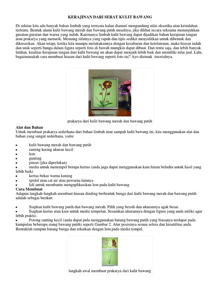 Akan tetapi ketika kita mampu melakukannya dengan kesabaran dan ketelatenan maka hiasan indah dan unik seperti bunga dalam figura seperti foto di bawah. Karenanya limbah kulit bawang dapat dijadikan bahan kerajinan tangan atau prakarya yang menarik. Alat dan bahan yang dibutuhkan untuk membuat kreasi ini adalah. Kulit nabati memiliki ketebalan yang berbeda tergantung kebutuhan produk.
