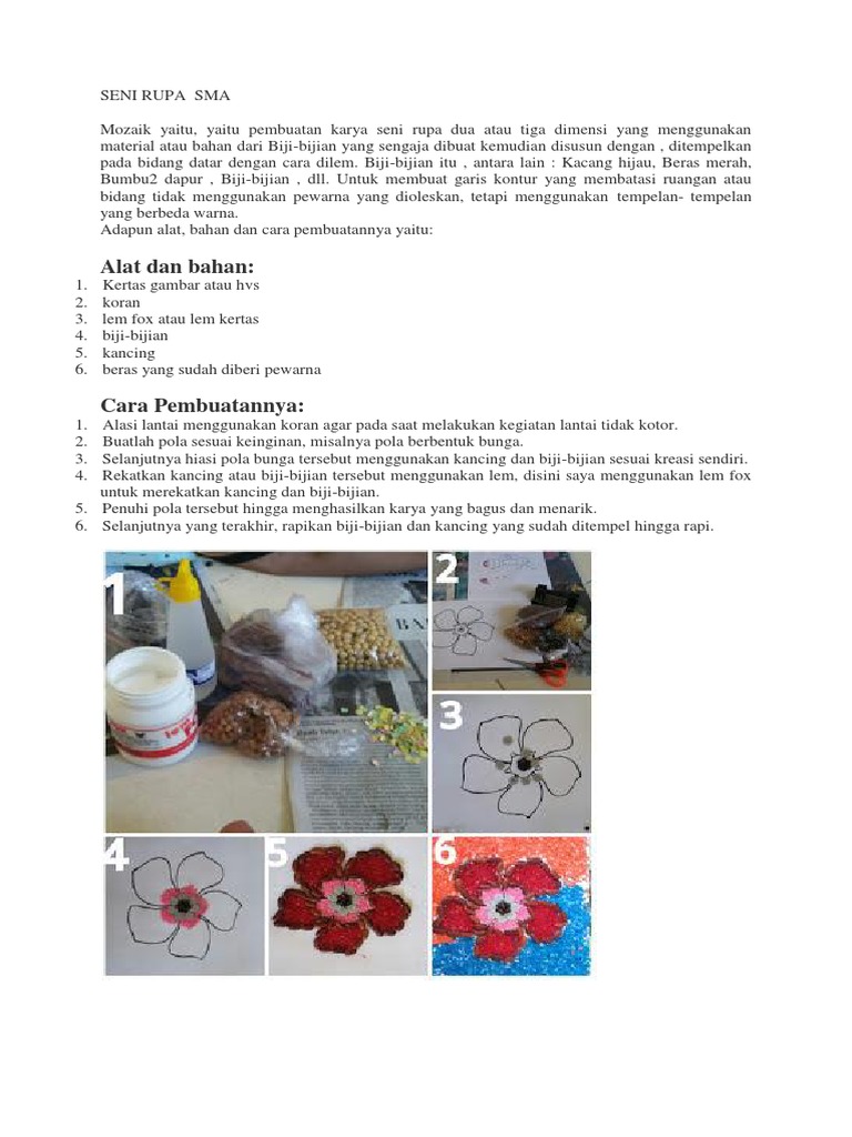 Persiapan alat dan bahan. Gambar 2 4 taburkan biji beras yang sudah diberi warna pada pola. Karya seni ini mulai dikenal jauh sejak 1500 sm di seluruh dunia. Dan bahan bahan tersebut nantinya akan ditempel pada bidang datar.