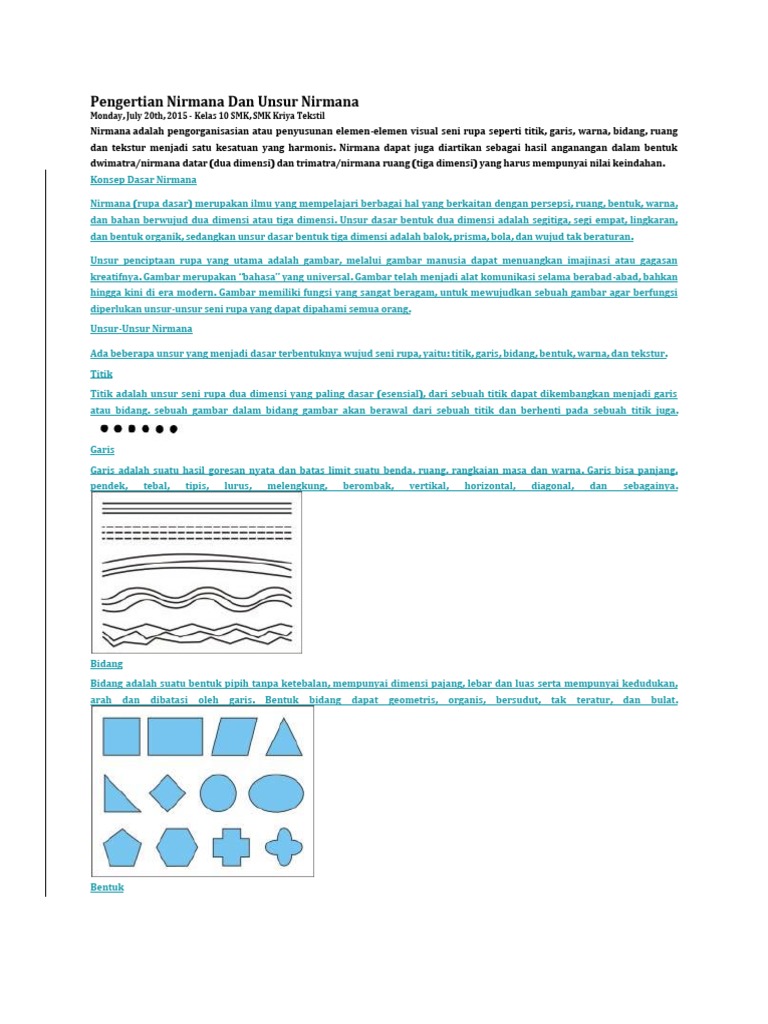 Perbedaan antara nirmana datar dan nirmana ruang yakni nirmana ruang atau 3d bisa dinikmati dari berbagai sudut pandang sedangkan nirmana datar atau 2d tidak demikian. Padahal kedua istilah ini memiliki arti yang kurang lebih sama dengan istilah dua dimensi dan tiga dimensi yang sudah umum dikenal masyarakat. Penutup evaluasi dan saran untuk mempersiapkan alat dan bahan untuk praktika minggu ke 2 pertemuan berikutnya tata aturan dalam membuat karya tugas nirmana dwi matra sebagai berikut. Nirmana adalah studi tentang berbagai masalah yang berkaitan dengan hubungan antara persepsi bentuk warna ruang dan materi berwujud dalam dua atau tiga dimensi.