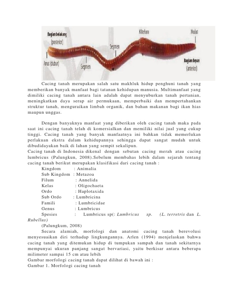 Cacing tanah jenis lumbricus mempunyai bentuk tubuh pipih. Letaknya ada di setiap bagian tubuh dari cacing tanah. Baca juga ragam komponen dan jenis sistem syaraf. Butuh rujukan jumlah segmen yang dimiliki sekitar 90 195 dan klitelum yang terletak pada segmen 27 32 butuh rujukan biasanya jenis ini kalah bersaing dengan jenis yang lain sehingga tubuhnya lebih kecil butuh rujukan tetapi bila diternakkan besar tubuhnya bisa menyamai atau melebihi jenis lain.