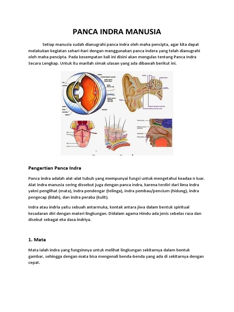 Dengan adanya mata kita bisa melihat objek lain dengan bantuan cahaya ada banyak bagian bagian mata baik bagian luar seperti alis dan kelopak atau pun bagian dalam seperti. Sebagian besar informasi yang di dapat berasal dari indra perasa yaitu. Hal itu dikarenakan pada permukaan kulit kita terdiri atas berbagai penerima rangsang yang akan menanggapi rasa sakit tekanan panas dan dingin. Mata telinga hidung lidah dan kulit.