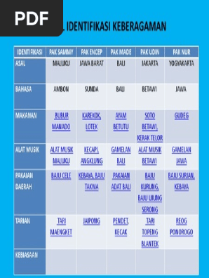 Alat musik ini dibunyikan dengan cara dipukul dengan alat pemukul. Namun alat musik tradisional di jawa barat tak hanya angklung ada banyak sekali alat musik tradisional lainnya yang berasal dari jawa barat yang tak kalah menarik dan unik. Alat musik daerah jawa timur ketertarikan tiap orang akan musik berbeda beda memang tidak ada salahnya jika kita menyukai musik jazz pop dangdut dan lain sebagainya namun ada baiknya kita tetap mengetahui alat musik daerah jawa timur dan cara memainkannya kebanyakan alat musik daerah tradisional dari jawa timur digunakan oleh masyarakat. Identifikasi keberagaman pak sammy pak encep pak made pak udin dan pak nur pada tabel meliputi asal bahasa makanan alat musik pakaian daerah tarian dan kebiasaan.