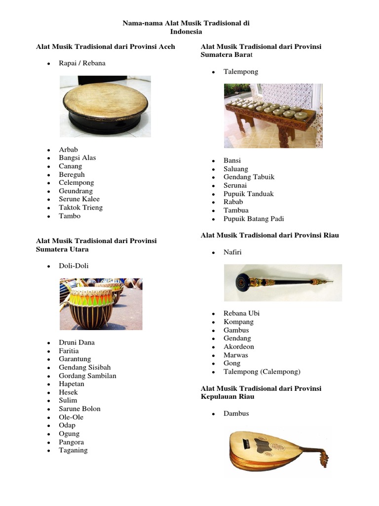 Alat musik tradisional dan asalnya 34 provinsi. Demikianlah daftar lagu lagu daerah indonesia dan asalnya lengkap 34 provinsi. Indonesia memang benar negara yang bhineka tunggal ika kita sangat bersyukur dengan keragaman negara kita. Cuma beberapa alat musik berikut ini adalah yang paling terkenal dan populer di masing masing daerah. Akan tetapi masih banyak bangsa indonesia yang tidak tahu adat istiadat.