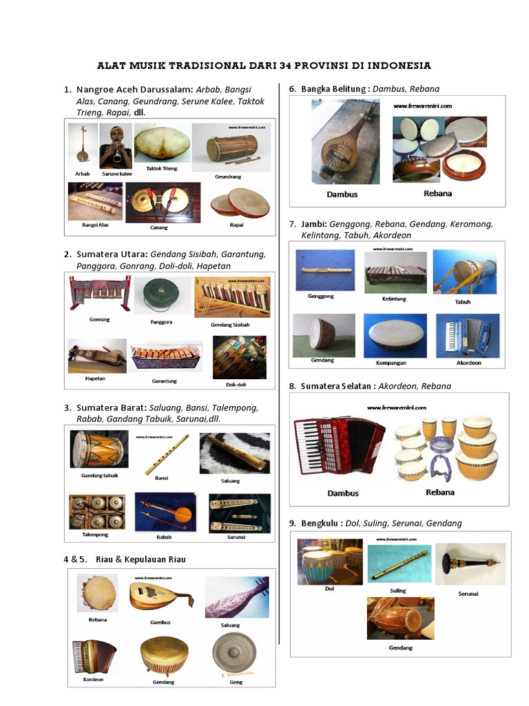 Beberapa alat musik tradisional dari 34 provinsi di indonesia antara lain. Alat musik tradisional 34 provinsi indonesia dan gambar. Kita mengetahui bahwa indonesia memiliki 34 provinsi mulai dari sabang sampai merauke dimana setiap daerah memiliki kesenian dan alat musik tradisional yang berbeda beda. Sekian artikel kali ini semoga bisa menjadi referensi pengetahuan bagi kita semua.