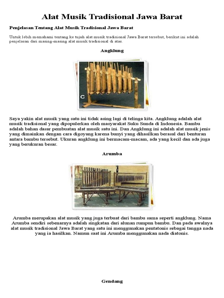 Hal ini tak lepas karena kekayaan budaya masyarakatnya. Alat musik tradisional demung merupakan salah satu instrumen gamelan yang termasuk dalam keluarga balungan pada satu set gamelan umumnya memiliki 2 demung kedua duanya mempunyai versi pelog dan sendro. Maka dari itu tak heran jika indonesia disebut sebagai negara paling kaya. Alat musik khas jawa barat berbicara mengenai alat musik tradisional asal jawa barat salah satu yang paling populer adalah angklung popularitas dari alat musik khas jawa barat satu ini bahkan telah mendunia.