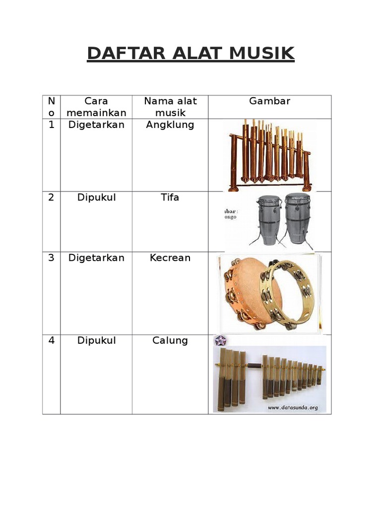 Jenis jenis alat musik sendiri dapaat dibedakan berdasarkan cara memainkannya sumber bunyinya atau fungsinya. Tapi kita tidak bisa memainkan alat musik yang seharusnya dipukul menggunakan alat tapi kita pukul menggunakan tangan begitu juga sebaliknya. Cara memainkan alat musik ini adalah dengan dipukul biasanya dipukul dengan tangan atau benda benda pukulan seperti stik. Saat ini terdapat banyak macam macam alat musik yang ada baik itu alat musik tradisional maupun alat musik modern.