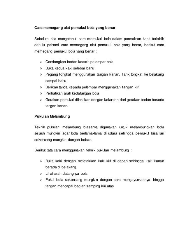 Alat pemukul dalam permainan kasti disebut dengan. Kayu pemukul bola kecil bendera tiang pemberhentian peluit dan kertas pencatat nilai. Posisikan alat pemukul hingga bisa sejajar dengan bahu. Teknik pukulan merendah dalam permainan bola kasti memiliki tujuan agar bola yang dipukul dapat melesat dengan kencang dan memantul ke tanah. Alat permainan kasti assalamualaikum wr wb alhamdulillah atas izin alloh swt serta ridho dari junjungan kita nabi muhammad saw kita dapat berjumpa lagi dalam pembahasan artikel kali ini.