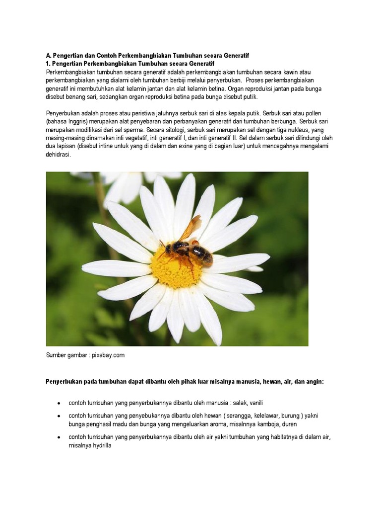 Reprodusi secara generatif diawali oleh peleburan gamet jantan dan betina. Biji merupakan alat untuk melestarikan keturunan tumbuhan yang bersangkutan. Akibatnya sifat sifat tumbuhan baru hasil reproduksi ini sama dengan tumbuhan induknya. Reproduksi generatif pada tumbuhan memiliki berbagai macam jenis penyerbukan yang dipengaruhi oleh beberapa faktor.
