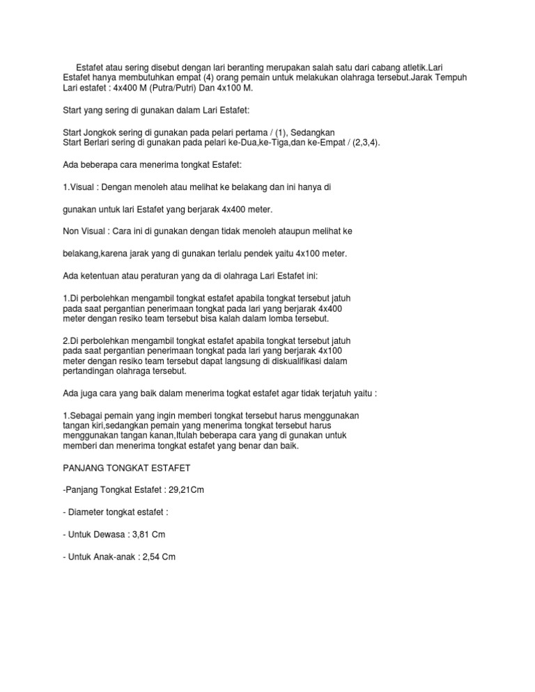 Pertama adalah nomor lari jarak 800 meter 1500 meter dan 3000 meter. Dalam satu regu lari sambung terdapat empat orang pelari yaitu pelari pertama kedua ketiga dan keempat. Panjang lintasan yang digunakan adalah 800 meter 1500 meter 5000 meter dan 10 000 meter. Sebelum melakukan olahraga lari.