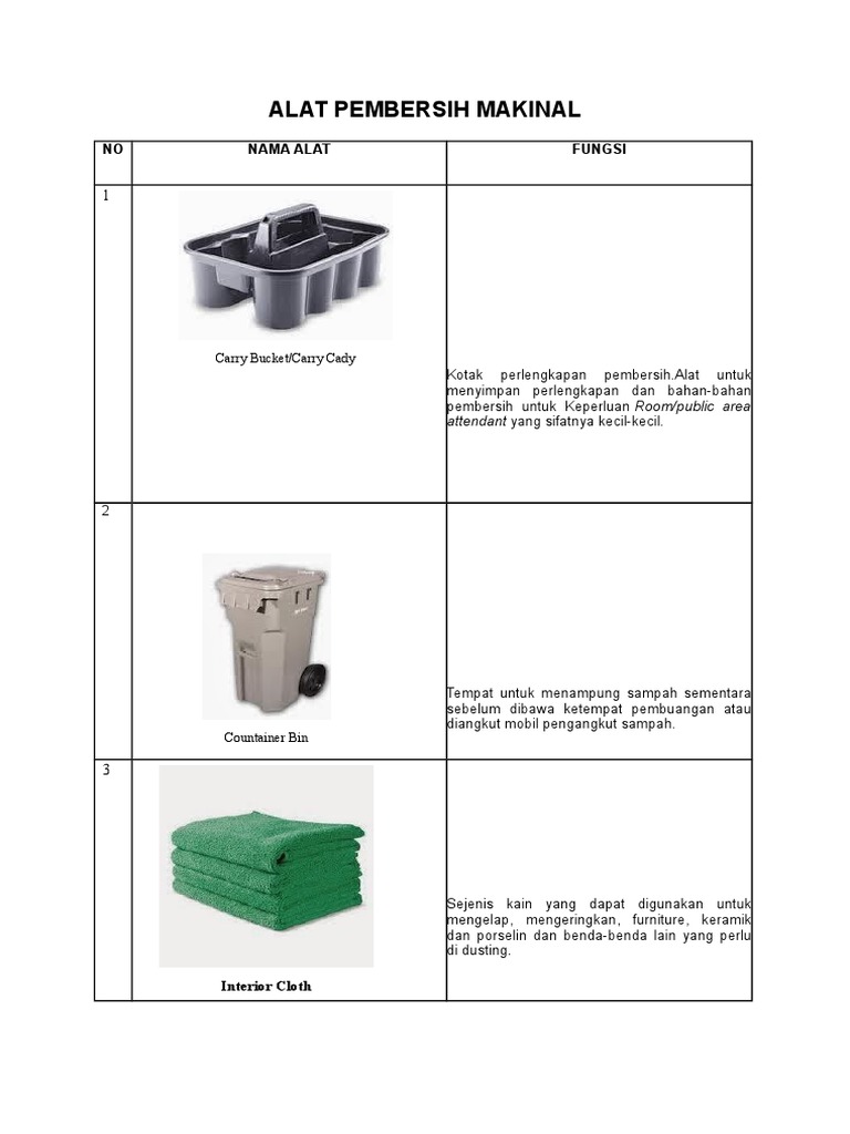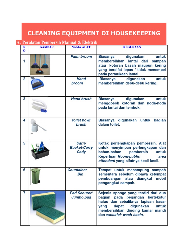 Peralatan alat kebersihan yang digunakan room attendant ada beragam mulai dari alat manual hingga yang bermesin. Room attendant membersihkan kamar dimulai dengan kamar occupied. Ajar id hello ajarian. Alat yang digunakan untuk membersihkan permukaan kaca dari air debu maupun kotoran lain yang menempel pada kaca.