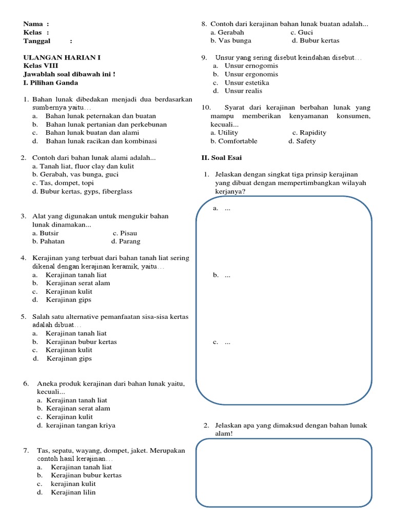 Bahan utama dari sebuah kerajinan ini dapat dengan mudah kamu dapati dari alam seperti tanah. Contoh dari bahan. Untuk membuat sebuah kerajinan dari bahan yang lunak kamu juga bisa menggunakan nya dengan bahan alami ataupun bahan buatan yang sesuai dengan kerajinan yang akan kamu buat tersebut. Alat membatik sendiri merupakan sutau benda atau perkakas yang digunakan untuk mempermudah kegiatan batik membatik.