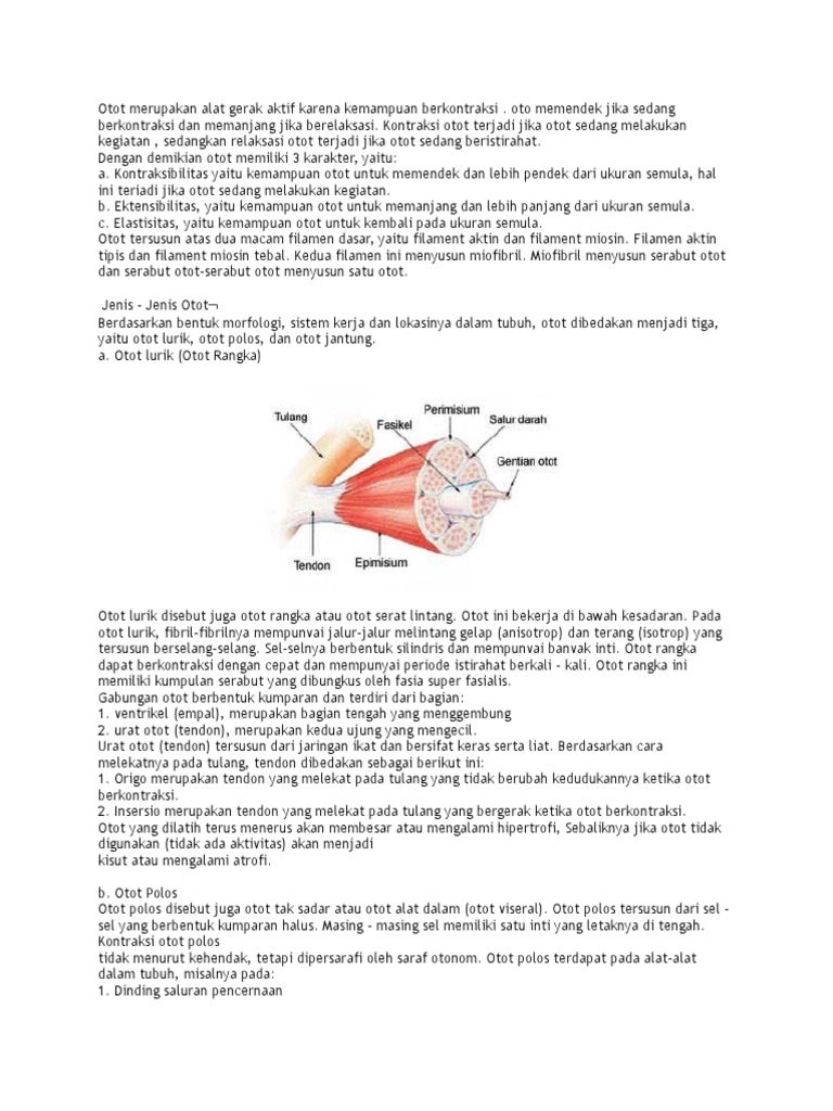Misalnya jantung usus dan. Otot adalah alat gerak aktif karena memiliki kemampuan untuk berkontraksi dan melakukan relaksasi. Kontraksi otot ini menyebabkan tulang yang dilekatinya dapat bergerak. Otot memiliki tiga karakteristik yaitu kontraksibilitas ekstensibilitas dan elastisitas.