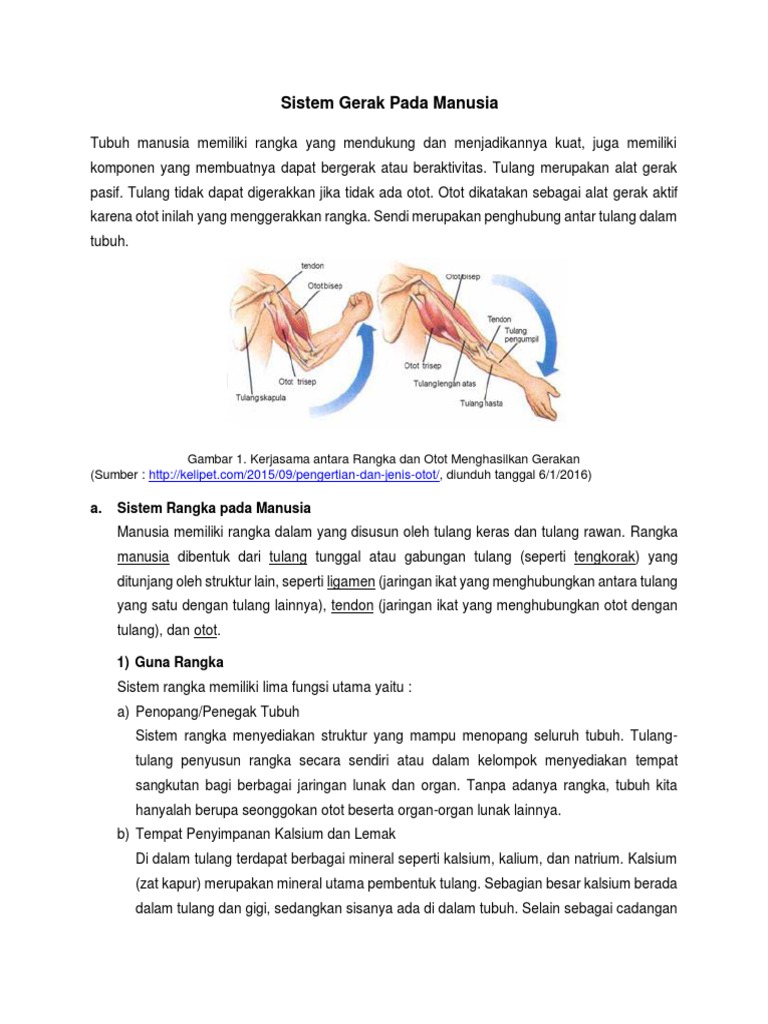 Tulang merupakan alat gerak pasif karena tulang dapat bergerak dengan bantuan otot. Kontraksi otot terjadi jika otot sedang melakukan kegiatan sedangkan relaksasi otot terjadi jika otot sedang beristirahat. Pada bab sebelumnya telah dipelajari mengenai jenis jenis otot secara ringkas. Dilansir dari situs kementerian pendidikan dan kebudayaan republik indonesia sifat khas jaringan otot yang berupa kemampuannya untuk berkontraksi.